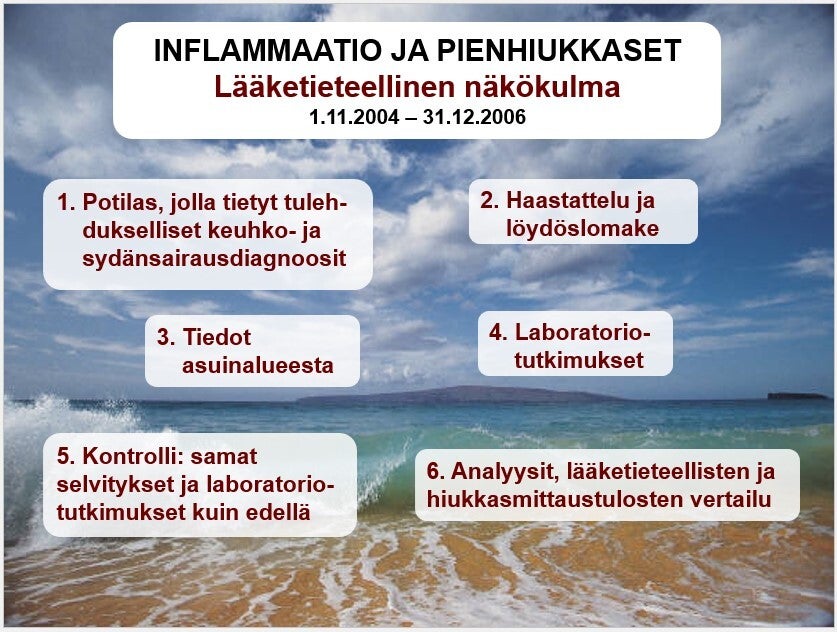 Salonen Iiris, Dufva Hilkka & Dufva Juhani. Open ward visits for cardiac ischemia and the concentration of ambient particulate matter in different age and diagnosis groups. Environmental Health Perspectives. 2007.
